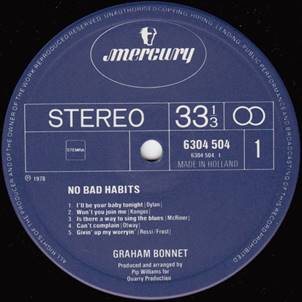 RLP22 NO BAD HABITS (Graham Bonnet) Partly recorded at Startling Studios (Ringo Starrs home at the time). This LP was supposed to have been released on Ring ORecords, but the label collapsed before it was released. Holland Mercury 6304 504 DISC = EX COVER = EX PRICE: 3,00